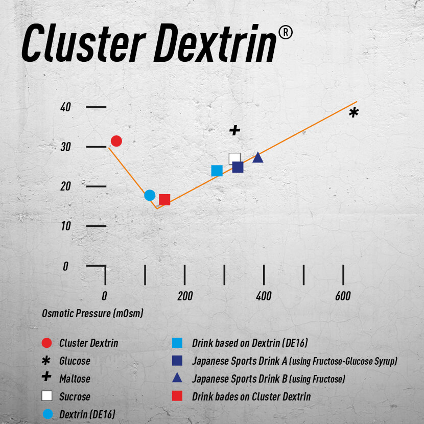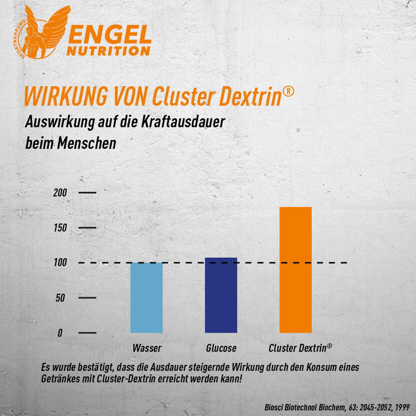 Unser patentiertes Cluster Dextrin® besitzt eine einzigartige, komplexe Molekularstruktur, ein höheres Molekulargewicht und ebenso eine höhere Osmolarität. In Verbindung mit seiner perfekten Löslichkeit werden die Kohlenhydrate so besser und schneller durch die Magen-Darm Passage in den Blutkreislauf transportiert. Das Ergebnis ist eine ultra schnelle und vollständige Wirkung bei absolut bester Verträglichkeit.