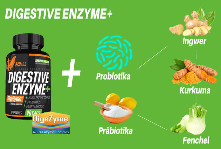 Jede Kapsel Engel Nutrition Digestive Enzyme+ liefert Dir 200mg der Enzymmischung DigeZyme®, clever kombiniert mit Probiotika, Präbiotika, so wie Ingwer, Kurkuma und Fenchel.