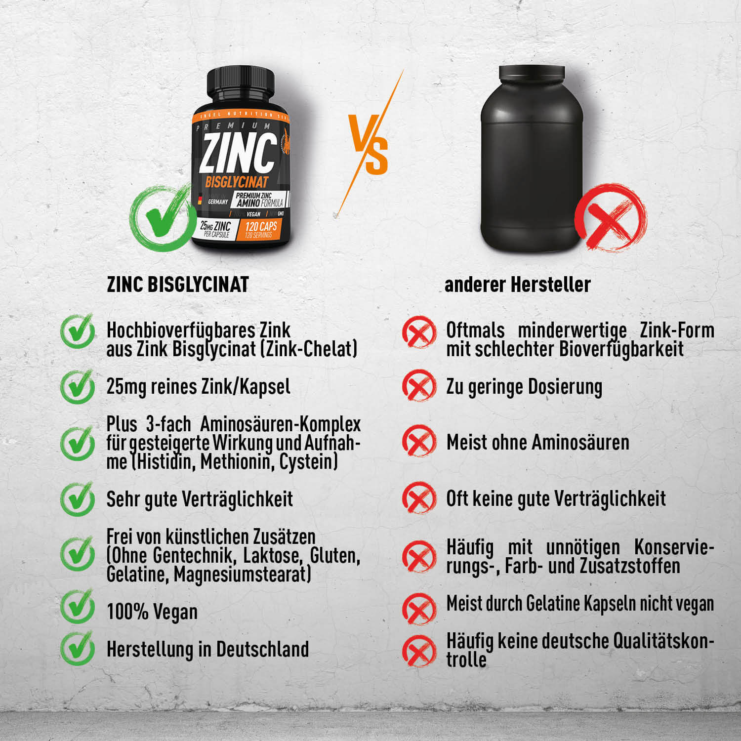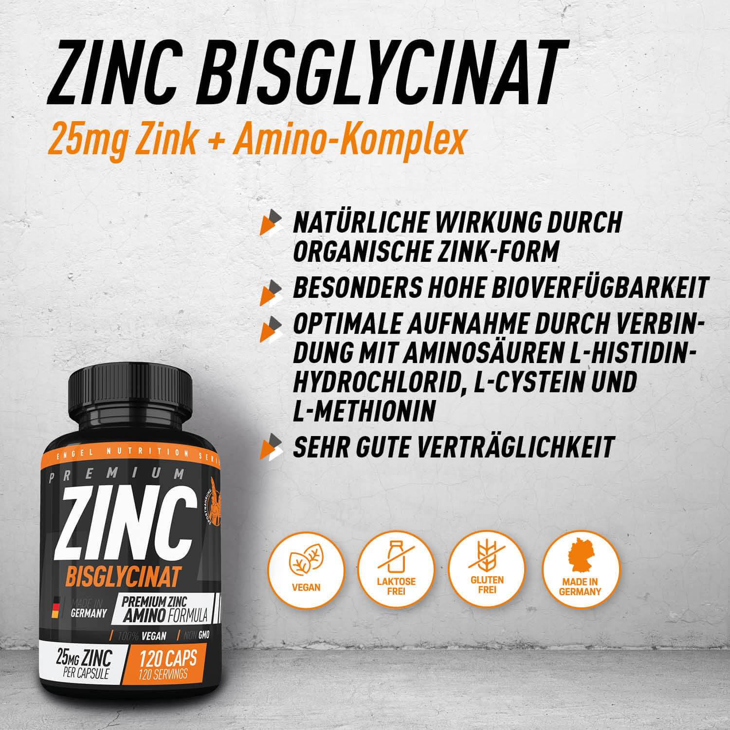 Während viele Zink-Formen nur schlecht resorbiert werden können oder zu geringe Dosierungen an elementarem Zink enthalten, gilt Zink Bisglycinat als die Premium-Zinkform mit einer besonders guten Bioverfügbarkeit.