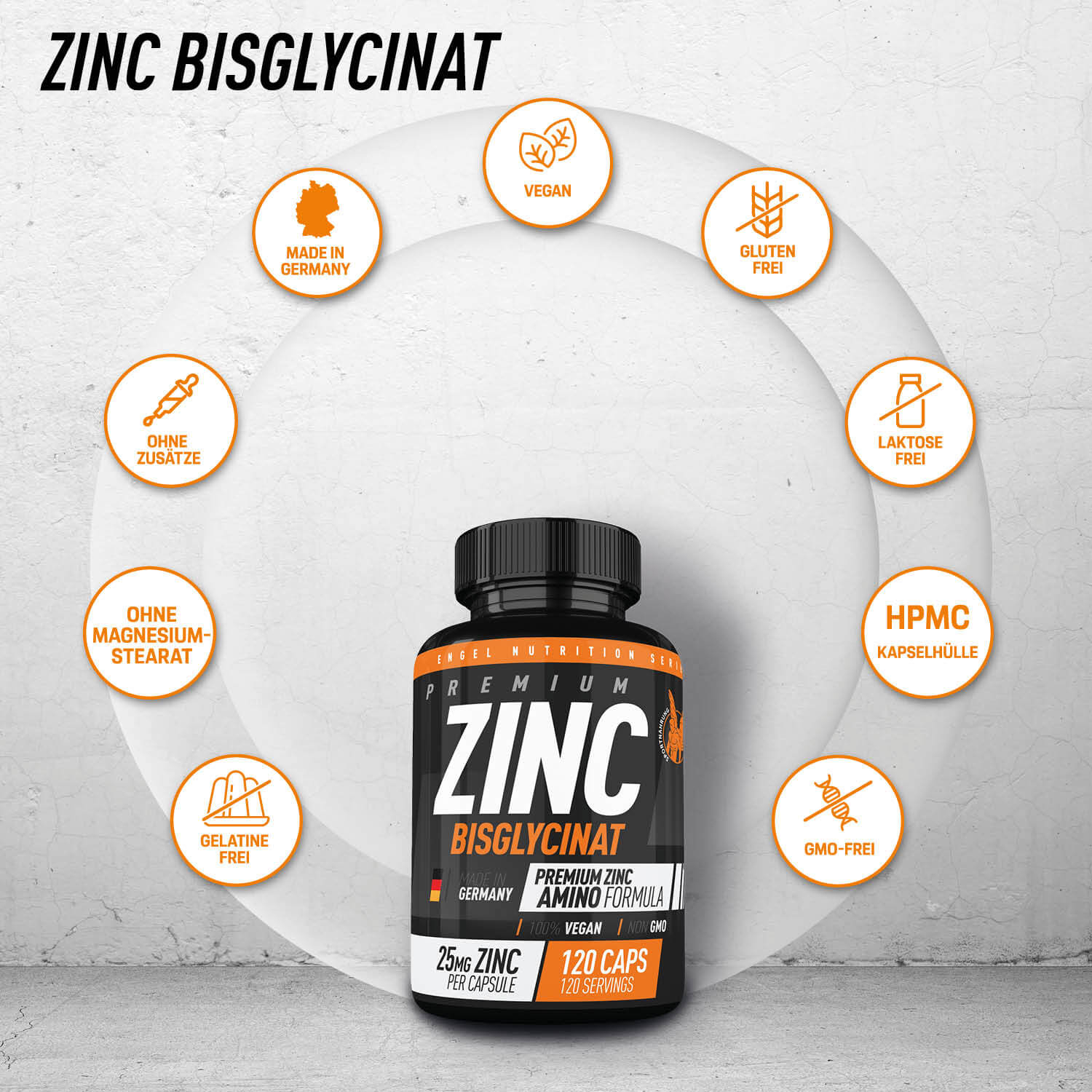 Premium Zink Supplement mit 25mg reinem Zink pro Kapsel in optimaler Bioverfügbarkeit durch Chelat Formel plus Amino-Komplex