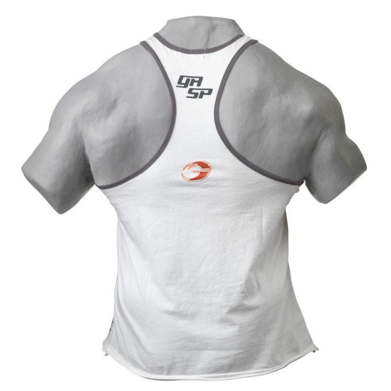 Abgesehen von der äußerst hochwertigen Qualität, ist das GASP Vintage T-Back zudem noch sehr stylisch gestaltet. Dieses Fitness Tanktop ist hauptsächlich in schlichtem Weiß gehalten worden. Auf der Vorderseite sowie auf Rückseite findet man einen Print des GASP Schriftzuges in Grau. Durch die Grau abgesetzten Ränder wird das ansonst schlichte Design des Tanktops zusätzlich aufgewertet. Zusätzlich zu dem GASP Schriftzug auf der Front, befinddet sich auf der linken Seite nochmals ein cooler Print in den Farben Grau und Orange.
