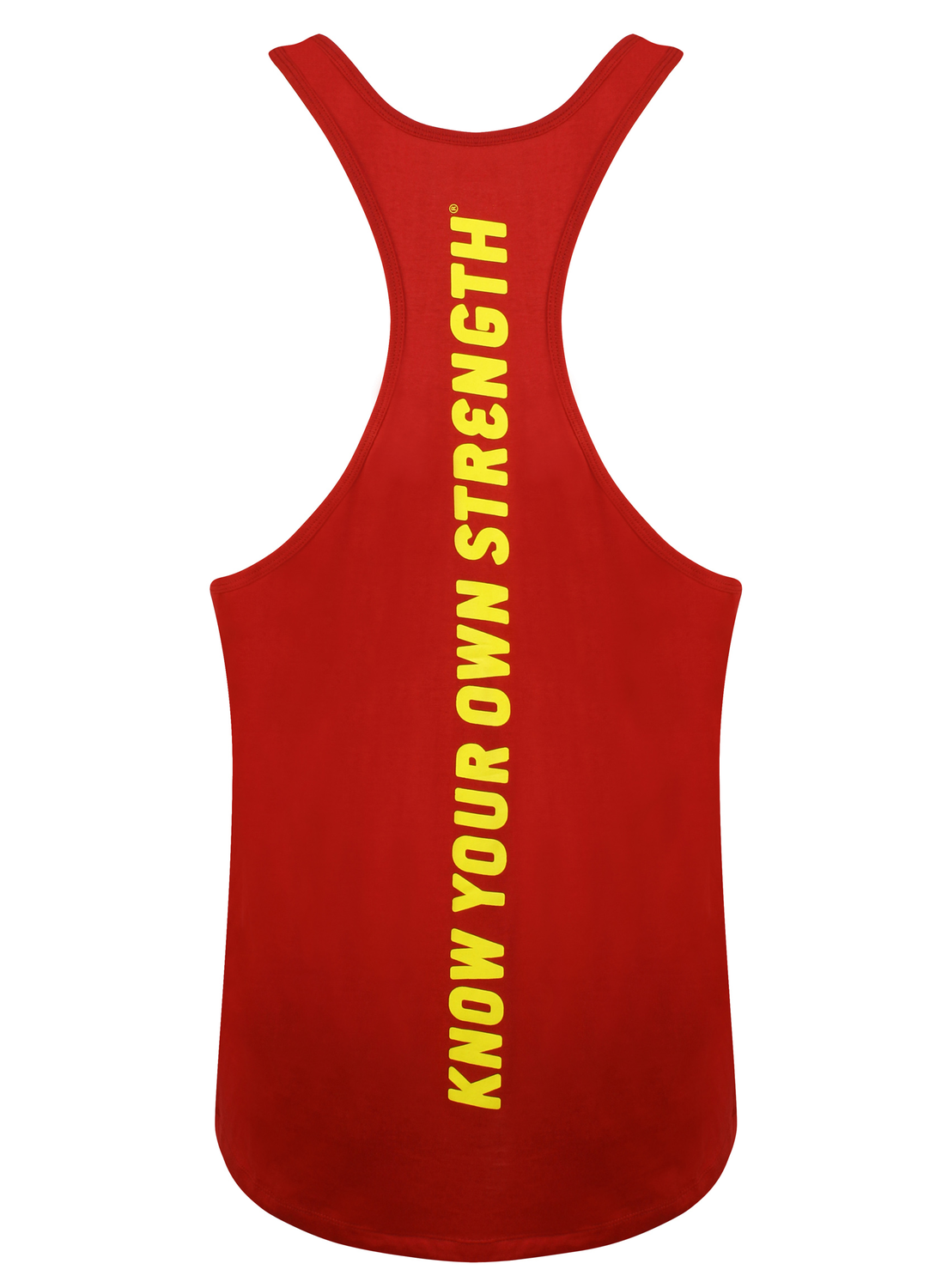 Das Golds Gym Muscle Joe Slogan Premium Tank hat eine bedruckte Vorder- und Rückseite. Auf der Vorderseite befindet sich standardmäßig der Original JOE mit dem Logoprint und auf der Rückseite wurde der Spruch "Know your own strength" vertikal aufgedruckt. Dies gibt dem Golds Gym Muscle Joe Slogan Premium Tank natürlich nochmal das gewisse Extra. Der Aufdruck auf der Vorderseite ist Weiß und der auf der Rückseite knallig Gelb.