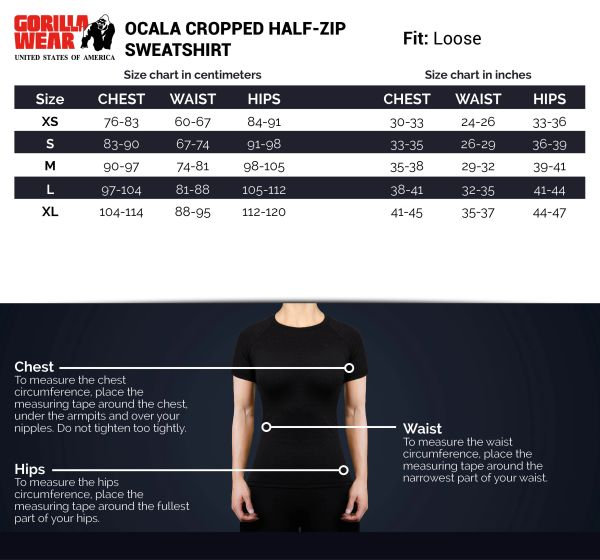 In Kombination mit einer Leggings kommt dieses Half-Zip Sweatshirt besonders gut zur Geltung – vor allem, wenn du eine hautenge Leggings von Gorilla Wear trägst. Was die Farbe betrifft, kannst du alles tragen, da das Ocala Cropped Half-Zip Sweatshirt zu hellen und dunklen Leggings passt.