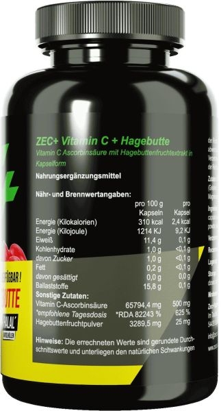 ZEC+ Vitamin C+ liefert pro Kapsel 500mg Vitamin C. Für eine bestmögliche Verfügbarkeit wurden die Halal zertifizierten Vitamin C Kapseln mit Hagebuttenfruchpulver angereicht.